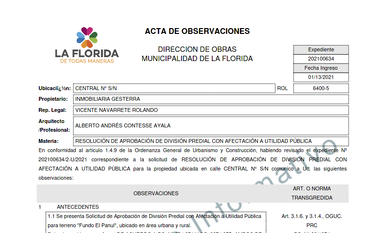 El alcalde de la Florida Rodolfo Carter había desestimado la denuncia interpuesta por la Red Precordillera hace algunos días, catalogándola de “falsa” Pero lo cierto es que efectivamente la inmobiliaria presentó un proyecto de urbanización, gracias al Plan Regulador vigente.