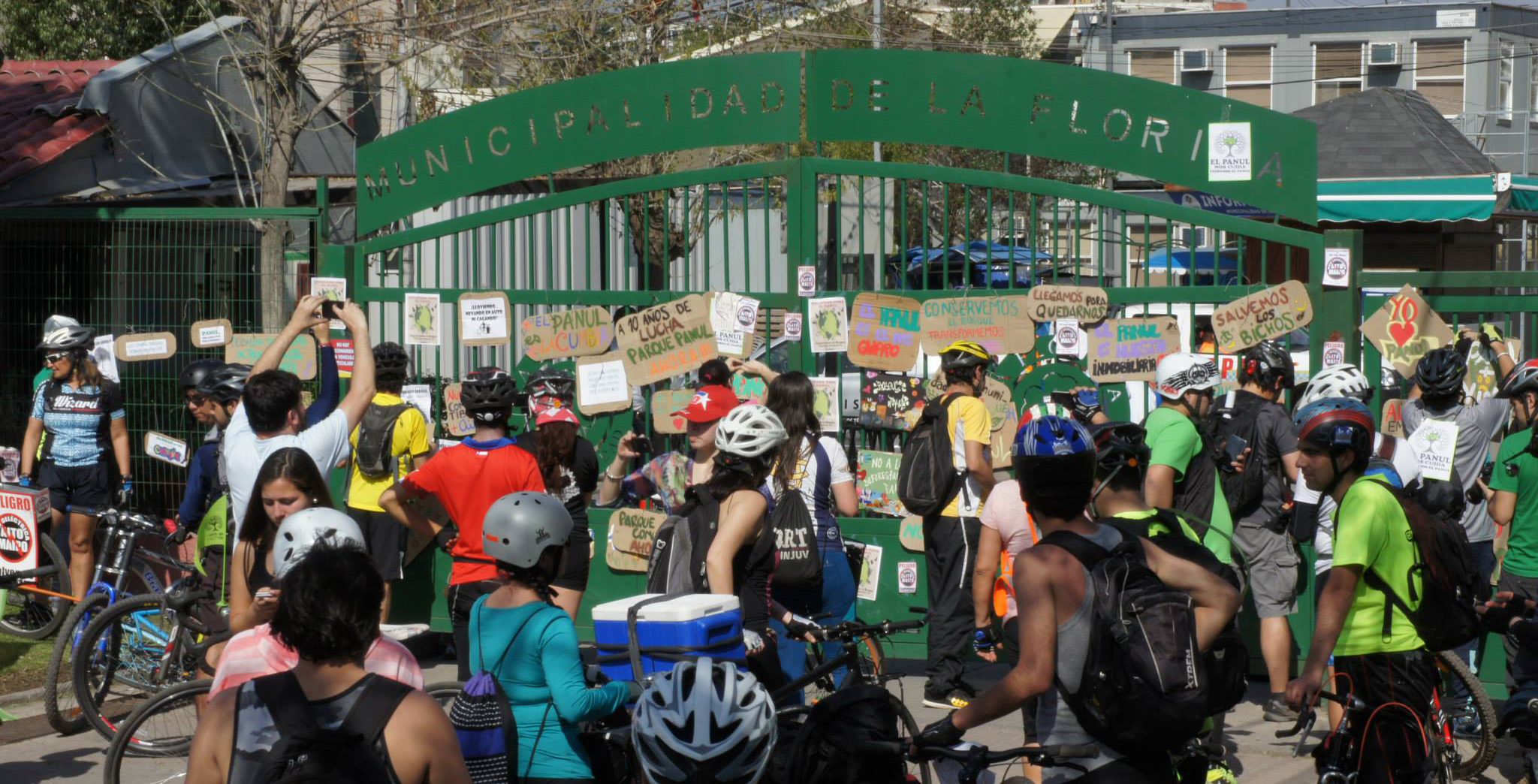 A eso de las 13:00 hrs del pasado domingo, con el sol pegando fuerte desde lo más alto, comenzaban a llegar los primeros ciclistas, cansados pero con una sonrisa de satisfacción tras pedalear con esfuerzo la gran pendiente que hay antes de llegar a la entrada del bosque. No tardó mucho tiempo en reunirse centenares de personas en bicicleta, quienes aprovechaban de adornar sus chanchas con banderines del Panul y letreros alusivos a la protección del bosque.